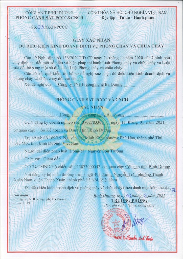 Công ty TNHH Công nghệ Ba Dương được thành lập năm 2019, là đơn vị hoạt động chuyên sâu trong lĩnh vực tư vấn, thiết kế, thi công và bảo trì hệ thống phòng cháy chữa cháy (PCCC) cho các công trình công nghiệp và dân dụng. Bên cạnh đó, Ba Dương còn triển khai thi công sơn chống cháy kết cấu, tư vấn thủ tục và cung cấp các giải pháp an toàn phục vụ công tác quản lý, vận hành công trình.